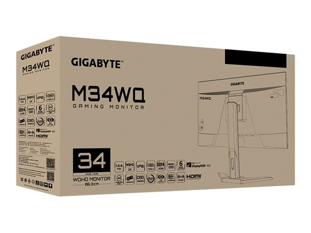 | Produktbeskrivning | Gigabyte M34WQ - LED-skärm - 34" - 3440 x 1440 WQHD @ 144 Hz - IPS - 400 cd/m² - 1000:1 - DisplayHDR 400 - 1 ms - 2xHDMI, DisplayPort, USB-C - högtalare - svart |