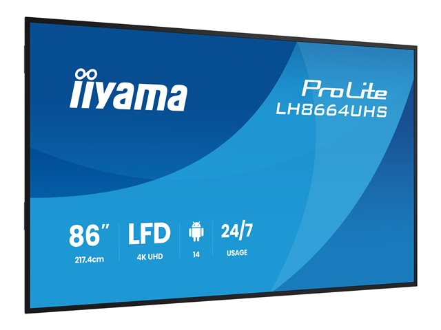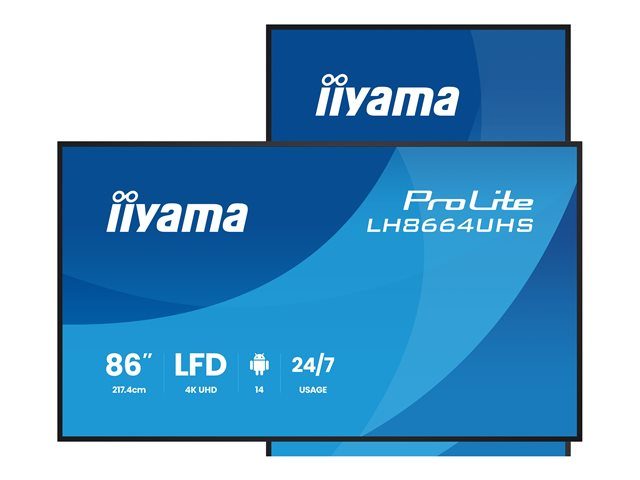 | Produktbeskrivning | iiyama ProLite LH8664UHS-B3AG - 86" Diagonal klass (85.6" visbar) LED-bakgrundsbelyst LCD-skärm - digital skyltning - med inbyggd SoC-mediespelare - Android - 4K UHD (2160p) 3840 x 2160 - svart (ram), matt finish |