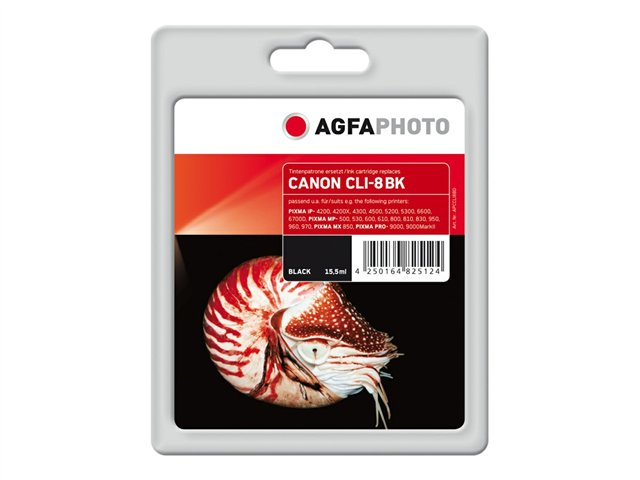 | Produktbeskrivning | AgfaPhoto - 15.5 ml - svart - kompatibel - bläckpatron (alternativ för: Canon 0620B001, Canon CLI-8Bk) - för Canon PIXMA iP4500, iP5300, MP520, MP600, MP610, MP810, MP960, MP970, MX850, Pro9000 |