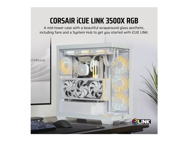 | Produktbeskrivning | CORSAIR iCUE LINK 3500X RGB - Mid tower - utökad ATX - genomskinlig sidopanel (härdat glas) - ingen strömförsörjning (ATX) - vit - USB/ljud |