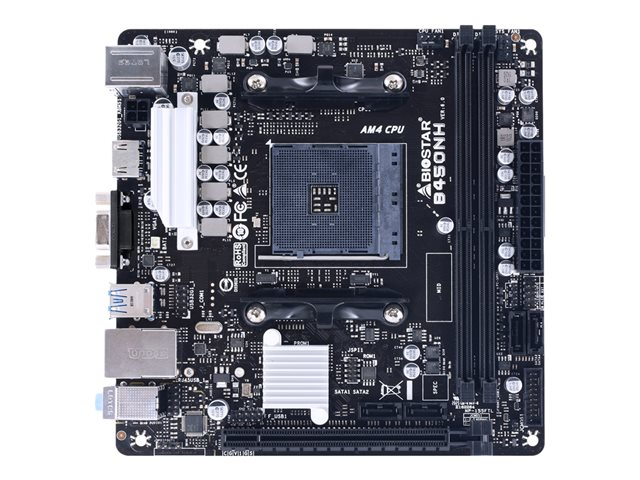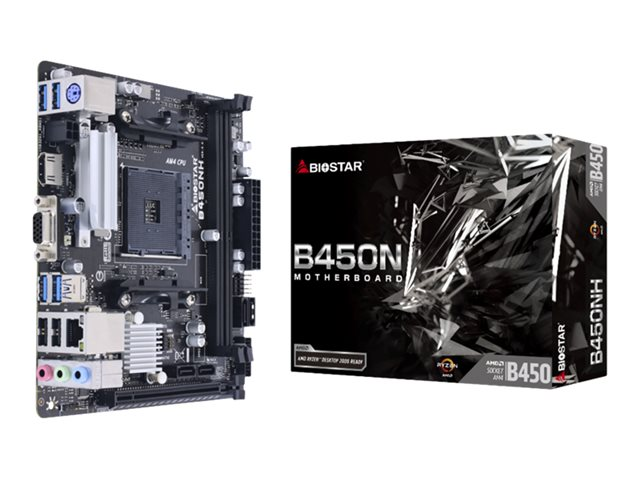 | Produktbeskrivning | Biostar B450NH - Moderkort - mini ITX - Socket AM4 - AMD B450 Chipuppsättning - USB 3.1 Gen 1 - Gigabit LAN - inbyggda grafiken (CPU krävs) - HD-ljud (8 kanaler) |