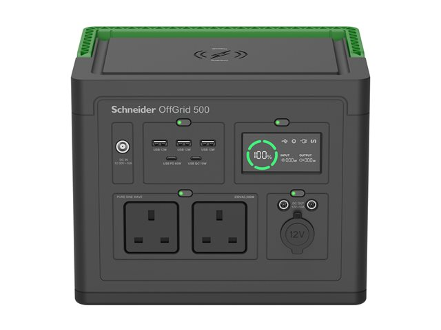 | Produktbeskrivning | Schneider OffGrid 500 - Bärbar kraftstation - LCD, 2 BS1363-uttag, sinuskurva, 3 USB-A, 2 USB-C, trådlös laddare - AC 195 - 265 / DC 12 -30 V - 500 Watt - litiumjon - 517 Wh - utgångskontakter: 2 - Storbritannien - svart, grön |