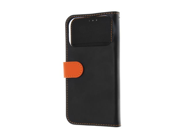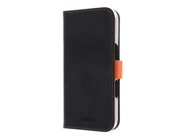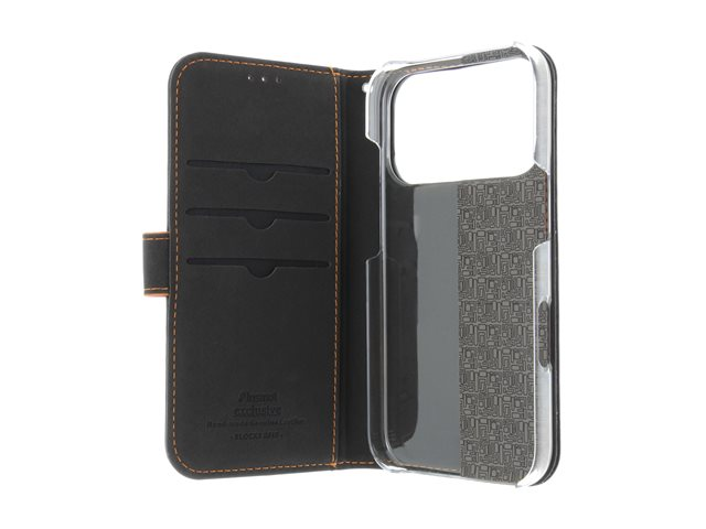 Produktbeskrivning | Insmat Exclusive - Vikbart fodral för mobiltelefon - genuint läder, kartong+papper, polykarbonat (PC), bomullssömmar, aluminiumfolie - svart, orange - för Apple iPhone 17 Pro |