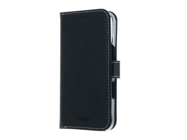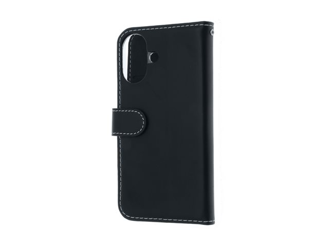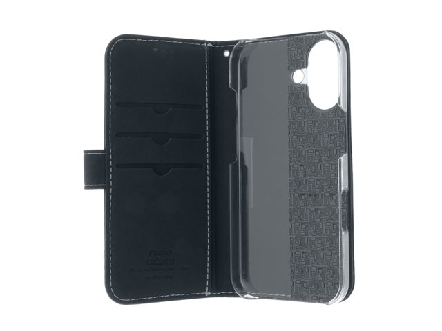 | Produktbeskrivning | Insmat Exclusive - Vikbart fodral för mobiltelefon - genuint läder, polykarbonat (PC) hållare, bomullssömmar, kartong+papper+aluminiumfolie - svart - för Apple iPhone 17 |