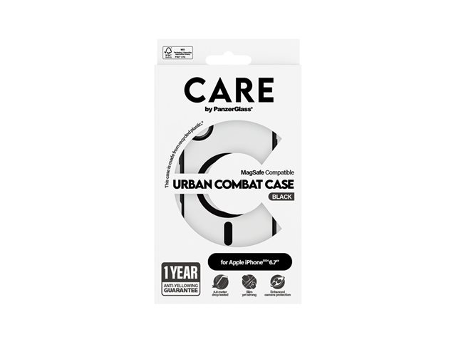 CARE by PanzerGlass Urban Combat - Baksidesskydd för mobiltelefon - med svart ram - MagSafe-kompatibilitet - återvunnen plast - transparent, svart - för Apple iPhone 16 Plus