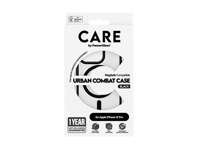 | Produktbeskrivning | CARE by PanzerGlass Urban Combat - Baksidesskydd för mobiltelefon - MagSafe-kompatibilitet - termoplastisk polyuretan (TPU), polykarbonat (PC) - transparent, svart - för Apple iPhone 15 Pro |