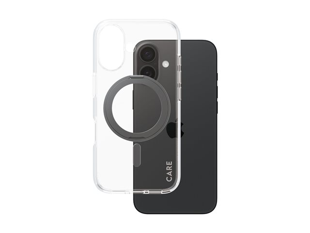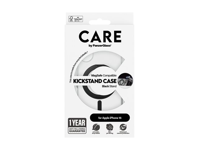 | Produktbeskrivning | CARE by PanzerGlass - Baksidesskydd för mobiltelefon - med fällbart ställ - MagSafe-kompatibilitet - termoplastisk polyuretan (TPU), polykarbonat (PC), aluminiumlegering - transparent, svart - för Apple iPhone 16 |