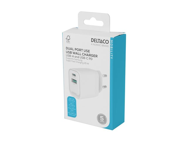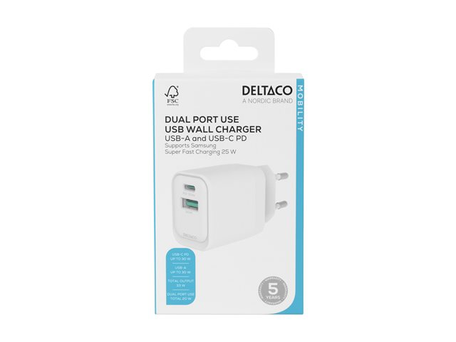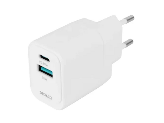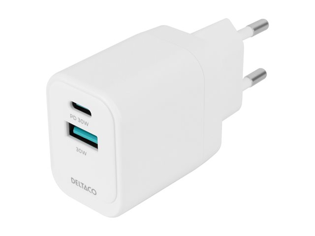 | Produktbeskrivning | DELTACO - Strömadapter - GaN - 33 Watt - PD/PPS, SFC - 2 utdatakontakter (24 pin USB-C, USB) - vit |