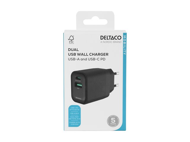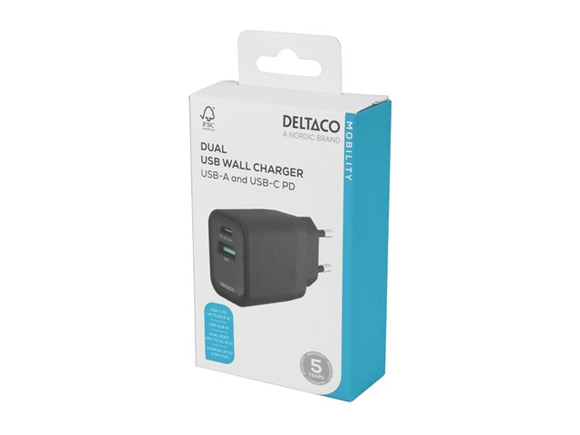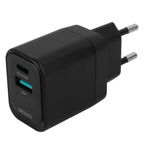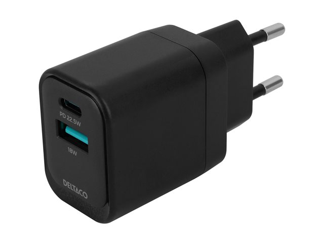 DELTACO - Strömadapter - 20 Watt - PD - 2 utdatakontakter (USB, 24 pin USB-C) - svart