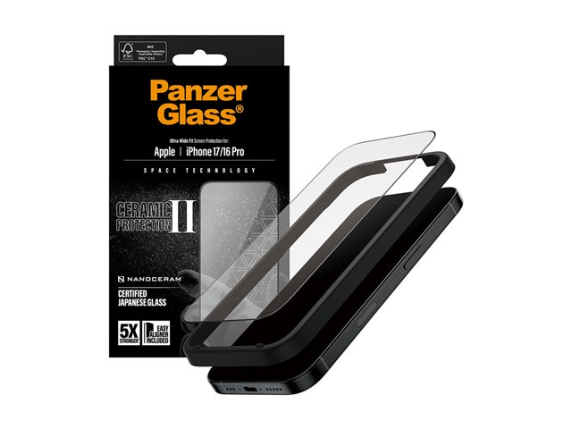 | Produktbeskrivning | PanzerGlass Ceramic Protection II - Skärmskydd för mobiltelefon - ultrabred passning med EasyAligner - glas - ramfärg svart - för Apple iPhone 16 Pro, 17 Pro |