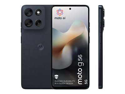| Produktbeskrivning | Motorola Moto G56 - 5G pekskärmsmobil - dual-SIM - RAM 8 GB / Internminne 256 GB - microSD slot - LCD-skärm - 6.72" - 2400 x 1080 pixlar (120 Hz) - 2 bakre kameror 50 MP, 8 MP - front camera 32 MP - pantone svart ostron |