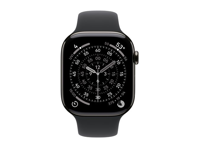 | Produktbeskrivning | Apple Watch Series 11 (GPS + Cellular) - 46 mm - skiffer titan - smart klocka med sportband - fluoroelastomer - svart - bandstorlek: M/L - 64 GB - LTE, Wi-Fi 4, UWB, Bluetooth - 5G - 43.1 g |