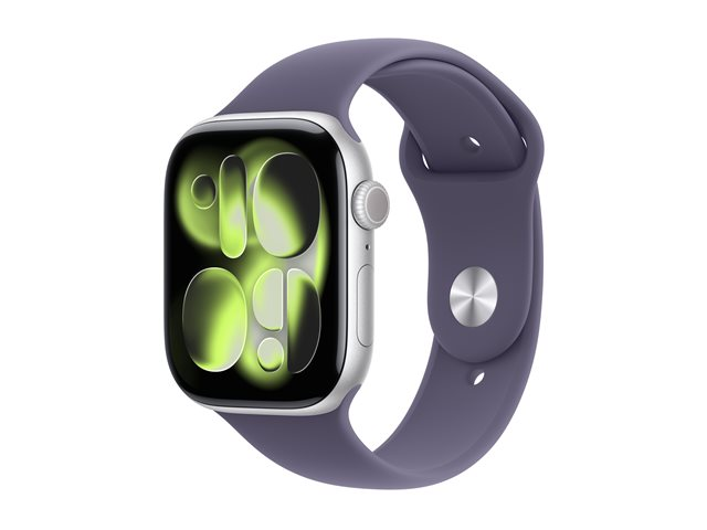 Produktbeskrivning | Apple Watch Series 11 (GPS) - 46 mm - silveraluminium - smart klocka med sportband - fluoroelastomer - lila dimma - bandstorlek: M/L - 64 GB - Wi-Fi 4, UWB, Bluetooth - 37.8 g |
