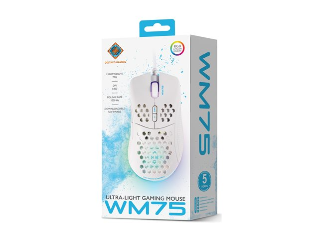 | Produktbeskrivning | DELTACO GAMING WM75 - Mus - låg vikt, RGB - 7 knappar - kabelansluten - USB - vit |