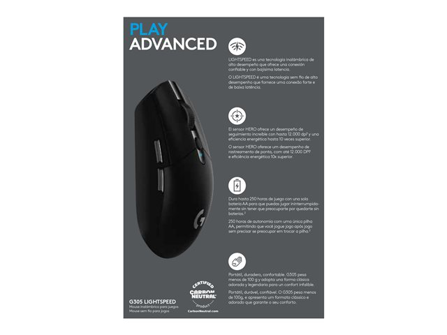 | Produktbeskrivning | Logitech G G305 - Mus - optisk - 6 knappar - trådlös - 2.4 GHz - trådlös USB-mottagare - svart |