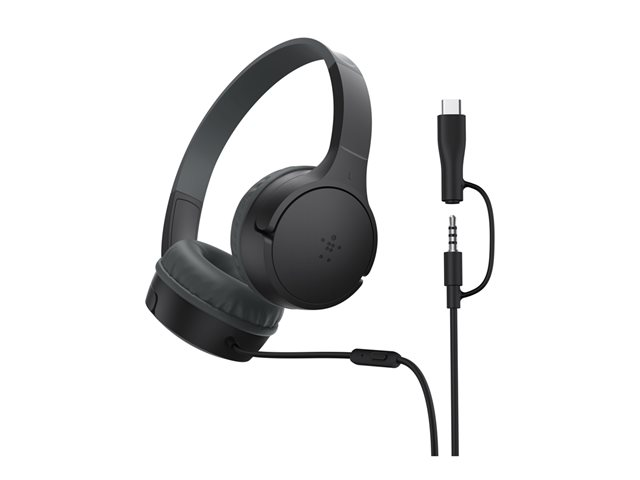 | Produktbeskrivning | Belkin SoundForm Mini - Hörlurar med mikrofon - på örat - kabelansluten - 3,5 mm kontakt, USB-C - svart |