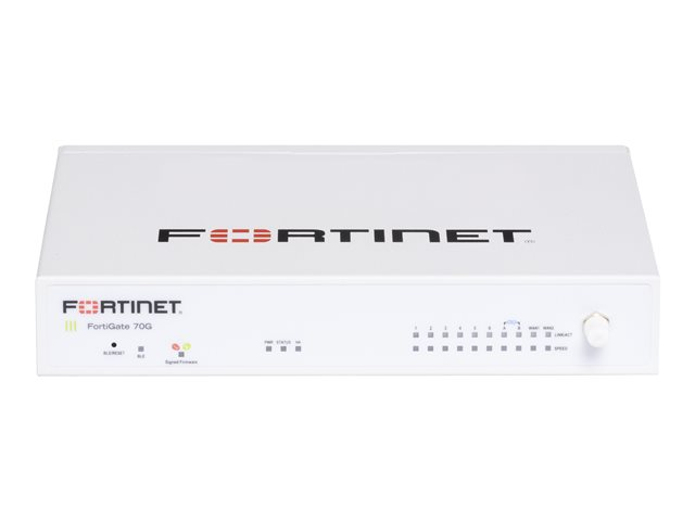 | Produktbeskrivning | Fortinet FortiGate 70G - Säkerhetsfunktion - med 5 års FortiCare premiumsupport + 5 års FortiGuard Enterprise Protection - 10 portar - 1GbE - molnhanterad - skrivbord |