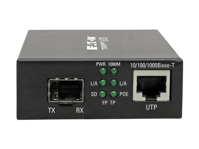 | Produktbeskrivning | Eaton Tripp Lite Series Gigabit SFP Fiber to Ethernet Media Converter, POE+, International Power Cables, 10/100/1000 Mbps - Fibermediekonverterare - 1GbE - 10Base-T, 100Base-TX, 1000Base-T - RJ-45 / SFP (mini-GBIC) - upp till 100 m - för P/N: N001-025-BK, N201-025-BL, N286-01GLX-SLX, N286-01GSX-MDLC |
