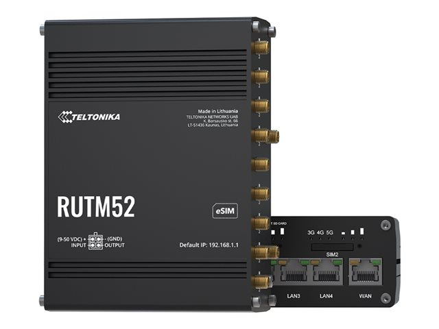 | Produktbeskrivning | Teltonika RUTM52 - Trådlös router - WWAN 4-ports-switch - 1GbE, 5G, LTE, HSPA - Wi-Fi 5 - Dubbelband - 3G, 4G, 5G - DIN-skenmonterbar, bordsmonterbar, väggmonterbar |