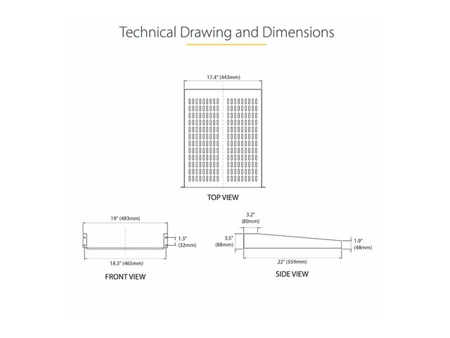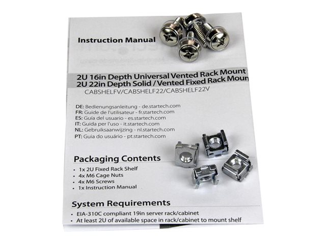 | Produktbeskrivning | StarTech.com 1U Server Rack Shelf, 2U 22in Universal Fixed Vented Network Rack Shelf/Cantilever Tray for 19" AV/Data/Network Equipment Enclosure w/Cage Nuts & Screws, 50lbs Weight Cap. - 2U Network Rack Shelf (CABSHELF22V) - Hylla för rack - svart - 2U - 22" - för P/N: RK12OD2, RK2433BKM, RK2537BKM, RK3236BKF, RK4236BKB, RK4242BK24, RK4242BK30 |