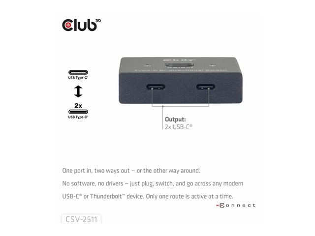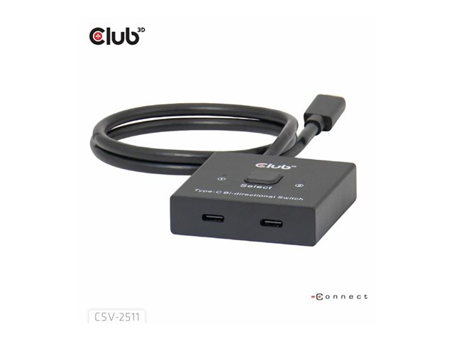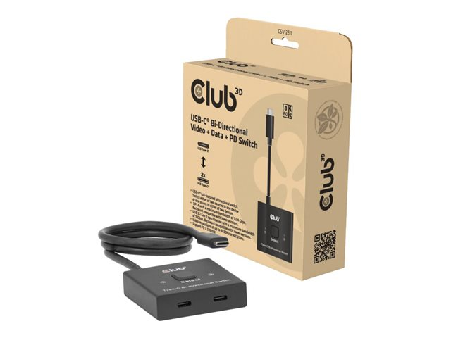 Club 3D CSV-2511 - Omkopplare för video - bi-directional, + data + PD - 2 x USB-C 3.2 Gen 2 - skrivbordsmodell