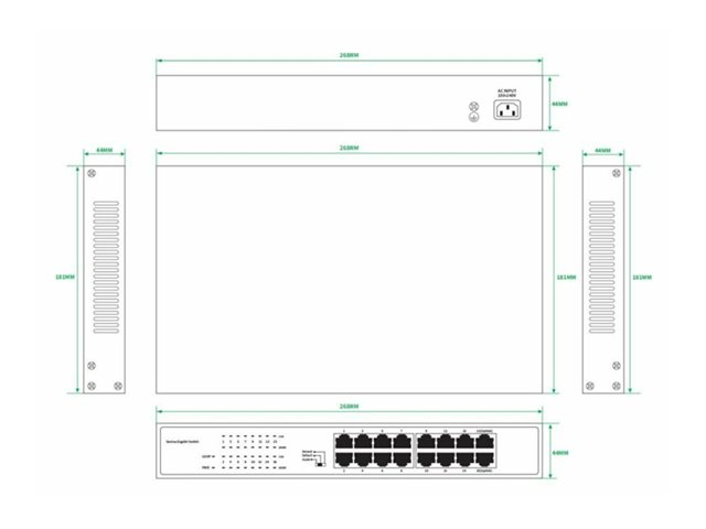 | Funktioner | Butik-och-framåt teknik, metallhölje, auto-uplink (auto MDI/MDI-X), QoS, flödeskontroll, halv/full duplex-läge, överspänningsskydd, VLAN-stöd, 2KV blixtskydd (differentialläge), 4KV blixtskydd (vanligt läge), 6KV ESD-skydd (kontakturladdning), 8KV ESD-skydd (luftrumsurladdning) |