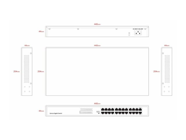 | Funktioner | Butik-och-framåt teknik, metallhölje, auto-uplink (auto MDI/MDI-X), flödeskontroll, halv/full duplex-läge, överspänningsskydd, 8KV ESD-skydd (luftrumsurladdning), 6KV ESD-skydd (kontakturladdning) |