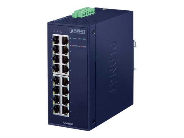 | Produktbeskrivning | PLANET IGS-1600T - Switch - 16 x 10/100/1000 - DIN-skenmonterbar, väggmonterbar - Växelström 24 V/likström 12-48 V |