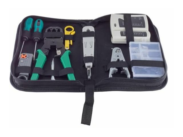 | Förpackningsinnehåll | Krimpverktyg, LAN cable tester, stripping tool with fine adjustment, universellt avdragverktyg, screwdriver - slot with rubber handle, cross screwdriver with rubber handle, 10 cable ties, 10 RJ45 connectors, IDC punch down tool with two fold-out pull hooks, IDC punch tool with cable stripper |