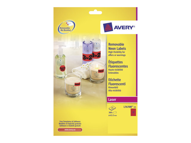 Avery L7670R - Neonröd - 63,5 mm rund 300 etikett (er) (25 ark x 12 runda etiketter