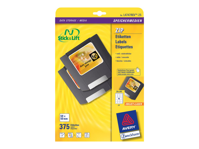 Avery Media Labels L4747 - Borttagbar häftning - 50 x 59 mm 375 stk (25 ark x 15) etiketter