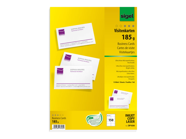 Sigel DP830 - Mikroperforerad - ljust vit - 85 x 55 mm - 185 g/m² - 150 kort (15 ark x 10) visitkort