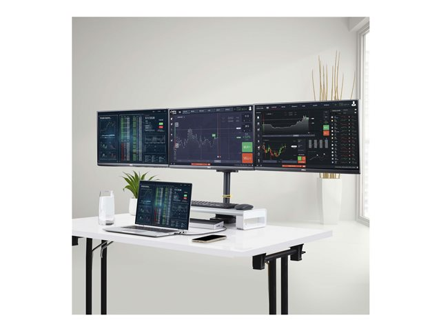 | Förpackningens innehåll | 2 x fjäderarm, 3 x VESA monitor mounts, 4 st. svängbara armar, stång, 12 st. M4x12-skruvar, 12 x M4x16 screws, kabelklämma, insexnyckel (3mm), insexnyckel (6 mm), 12 x M5x12 screws, 12 x M5x16 screws, 12 x flat washers, 12 x brickor, bordsklämma, shoulder pole mount, center pole mount, center monitor mount, tool holder, grommet clamp plate, grommet clamp screw |