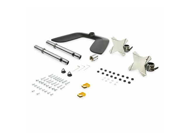 2 x VESA skärmfästen, 8 x M4x30-skruvar, insexnyckel (4 mm), insexnyckel (3mm), 8 x brickor, 16 x brickor, nedre stång, bas, 8 x M4x14-skruvar, 8 x M5x14-skruvar, övre stång, stånganslutning, 2 st. krokar till kabelhantering, 3 mm insexnyckel med skruvmejselspets, 2 st. krokskruvar till kabelhantering, 8 x M5x30-skruvar
