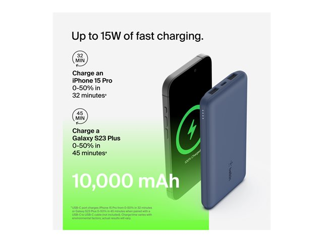 Belkin BoostCharge - Power bank - 10000 mAh - 18 Watt - 3 utdatakontakter (USB-C, 2 x USB) - blå